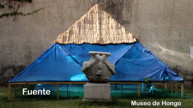 Fuente es una instalación que propone la creación de un nuevo ambiente controlado de temperatura, en base a la circulación de agua. Compuesta por una cúpula en forma de pirámide, estructurada por fierro y plástico biodegradable, contiene dentro una especie de cenefa de agua. Esta cortina húmeda se presenta como un envoltorio transparente para un nuevo mundo donde proliferan hongos ostra. Éstos conviven sobre una estructura octagonal de madera, escondidos detrás de la cascada que se extiende desde la pileta original del museo. Detrás de la cortina de agua, existe un nuevo paisaje con condiciones ambientales que dependen del agua, la temperatura, y el oxígeno.